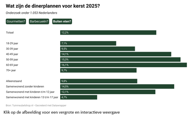 Kerst speelt zich niet langer alleen binnenshuis af. Bijna één op de acht Nederlanders is namelijk van plan om het kerstdiner dit jaar (deels) buiten te nuttigen, blijkt uit een onderzoek dat Tuinmeubelshop liet uitvoeren onder een representatief panel van 1.053 Nederlanders. Daarmee lijkt wintergebruik van tuin en overkapping definitief ingeburgerd.