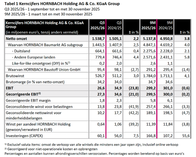 In het derde kwartaal van het boekjaar 2025/26 (1 september tot en met 30 november 2025) realiseerde de Hornbach Group een omzet van 1.538,7 miljoen euro. Dit is een stijging van 2,2% ten opzichte van hetzelfde kwartaal vorig jaar. Over de eerste negen maanden van dit boekjaar kwam de groepsomzet uit op 5.137,8 miljoen euro, een groei van 3,8% vergeleken met dezelfde periode een jaar eerder. De aangepaste EBIT van 299,5 miljoen euro over de eerste negen maanden lag op hetzelfde niveau als vorig jaar, ondanks sterk toegenomen personeels- en bedrijfskosten. In Nederland wist Hornbach haar marktaandeel in het derde kwartaal verder te vergroten en verstevigde hiermee haar leidende positie in de doe-het-zelfbranche.