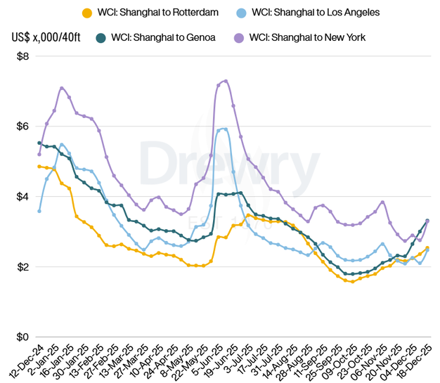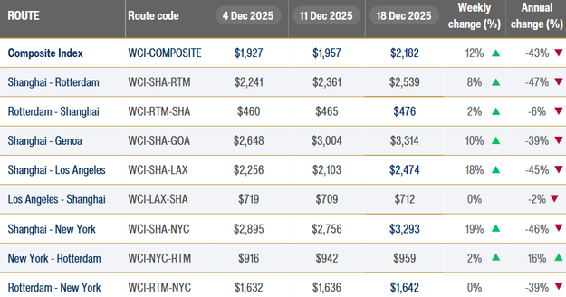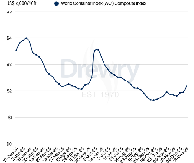 De World Container Index (WCI) van Drewry, een wekelijkse index die de gemiddelde spotprijzen weergeeft voor het vervoer van een 40-voets container op belangrijke mondiale zeevaartroutes, is in de week van 19 december met 12% gestegen naar $2.182 per 40ft container.