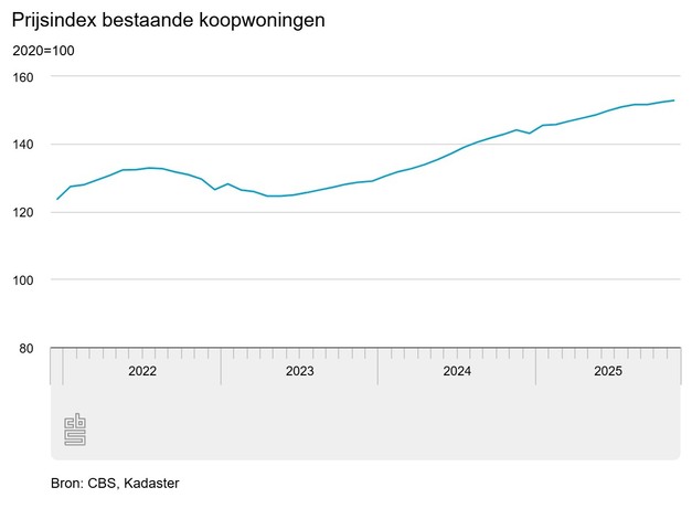 Ten opzichte van oktober 2025 stegen de prijzen van bestaande koopwoningen in november 2025 met 0,3 procent. De prijzen van bestaande koopwoningen bereikten in juli 2022 een piek. Daarna sloeg de trend om en daalde de prijsindex enige tijd. Sinds juni 2023 is de trend echter weer stijgend. In november lagen de prijzen gemiddeld 14,9 procent hoger dan bij de vorige piek in juli 2022.