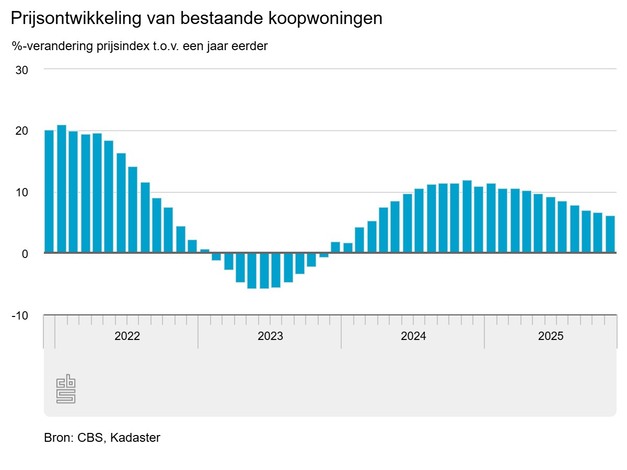 In november 2025 waren de prijzen van bestaande koopwoningen gemiddeld 6,1 procent hoger dan een jaar eerder. Voor de achtste maand op rij vlakt de prijsstijging af. Ten opzichte van oktober 2025 stegen de prijzen gemiddeld met 0,3 procent. De prijsontwikkelingen in dit bericht zijn gebaseerd op de prijsindex van bestaande particuliere koopwoningen in Nederland van het Centraal Bureau voor de Statistiek (CBS) en het Kadaster.