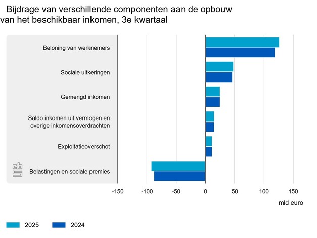 Het inkomen van zowel werknemers als zelfstandigen lag hoger dan in het derde kwartaal van 2024. De totale beloning van werknemers groeide met 6,6 procent. Het aantal banen van werknemers groeide met 1,7 procent, en de cao-lonen waren 4,6 procent hoger. Het gemengd inkomen lag 1,3 procent hoger.