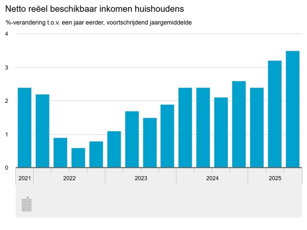 Het reëel beschikbaar inkomen van huishoudens (inkomen gecorrigeerd voor prijsveranderingen) was in het derde kwartaal van dit jaar 3,5 procent hoger dan een jaar eerder. De toename is vooral toe te schrijven aan een stijging van de beloning van werknemers, door hogere cao-lonen, en een stijging van sociale uitkeringen. De hypotheekschuld groeide met 12,7 miljard euro ten opzichte van een kwartaal eerder, naar 924,2 miljard euro. Dit meldt het Centraal Bureau voor de Statistiek (CBS) op basis van nieuwe cijfers over de financiën van huishoudens.
