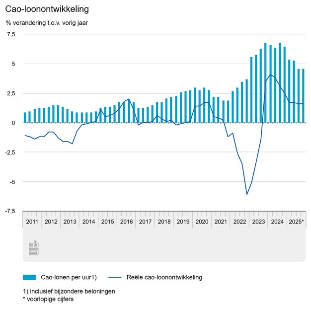De cao-lonen waren in het vierde kwartaal van 2025 4,6 procent hoger dan in hetzelfde kwartaal een jaar eerder. Na het derde kwartaal van 2024 (6,8 procent) stijgen de lonen minder hard, met de laagste toename in de tweede helft van 2025.