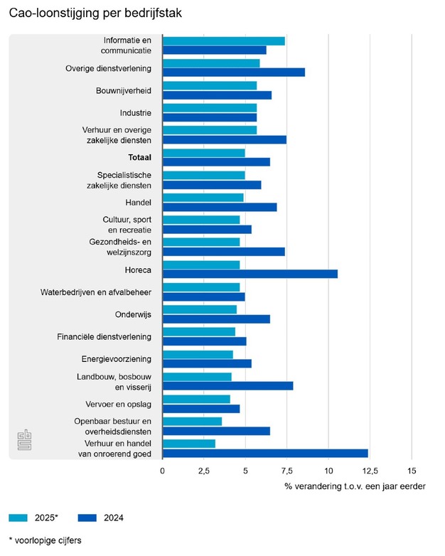 Op het niveau van bedrijfstakken stegen de lonen in 2025 met 3,2 procent het minst in onroerend goed (woningcorporaties), gevolgd door de bedrijfstak openbaar bestuur. In 2024 namen de lonen in de bedrijfstak onroerend goed juist nog het meest toe, met 12,4 procent.