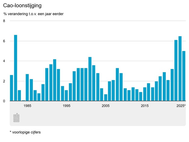In 2025 lagen de cao-lonen gemiddeld 5,0 procent hoger dan in 2024. De loonstijging is lager dan in de twee jaren ervoor, maar wel een van de hoogste in de afgelopen veertig jaar. Gecorrigeerd voor inflatie zijn de lonen met 1,6 procent toegenomen. Dit meldt het Centraal Bureau voor de Statistiek (CBS) op basis van nieuwe cijfers.