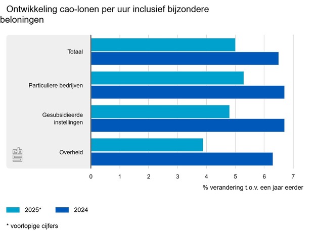 De voorlopige cijfers over 2025 zijn gebaseerd op 98 procent van de cao's waaruit de statistiek is opgebouwd. Drie kwart van de werknemers valt onder een cao.