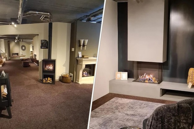 Showroom van De Groot Kachels met bedrijfswagen in Kerkdriel.