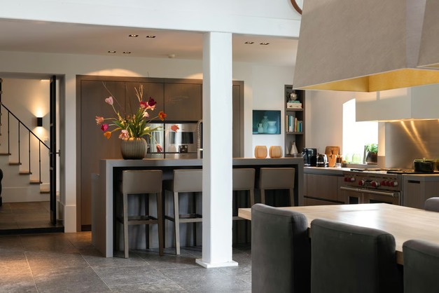 Op de begane grond bevinden zich onder meer een ruime ontvangsthal met open haard, een royale woonkamer met openslaande deuren naar het terras en een woonkeuken met een plafondhoogte van circa 8,5 meter. De keuken is uitgerust met hoogwaardige apparatuur. Daarnaast zijn er meerdere werk- en ontspanningsruimtes, technische voorzieningen en een inpandige garage met autolift.