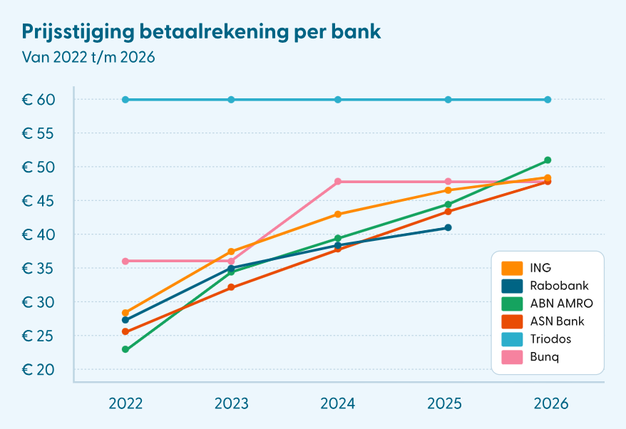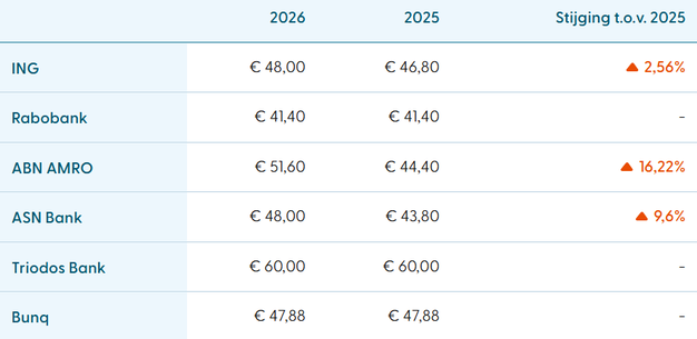Bij ING stijgt de prijs van €28,20 in 2022 naar €48 in 2026, een toename van 158% ten opzichte van 2019 (€18,60). ABN AMRO rekent volgend jaar €51,60 voor een betaalrekening, het hoogste bedrag onder de grote banken en een stijging van ruim 120% ten opzichte van 2022. Andere banken laten de tarieven minder sterk stijgen: Rabobank blijft voorlopig €41,40 vragen, terwijl Triodos Bank (€60) en Bunq (€47,88) stabiel blijven maar relatief duur zijn.