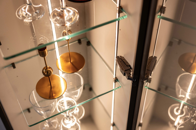 Glas in gerookt messing in industriële stijl.