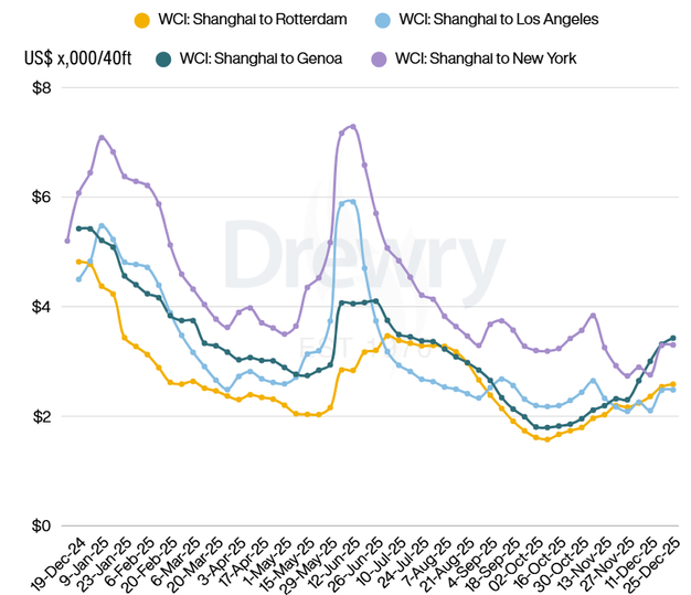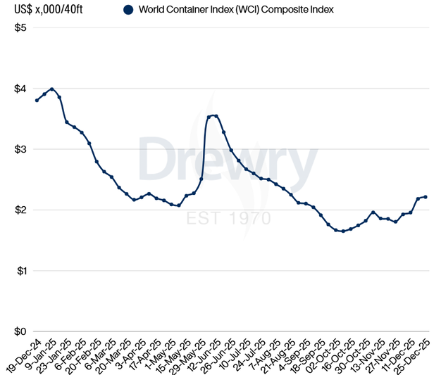 De World Container Index (WCI) van Drewry, een wekelijkse index die de gemiddelde spotprijzen weergeeft voor het vervoer van een 40-voets container op belangrijke mondiale zeevaartroutes, is in de week 25 december met 1% gestegen naar $2.213 per 40ft container. Het is een kleine stijging tijdens de feestdagen.