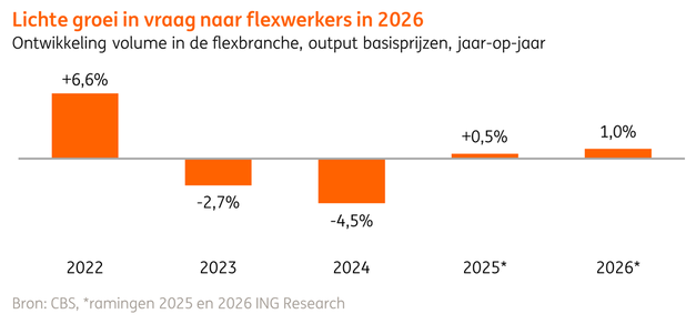 Na twee jaren van krimp stabiliseerde vorig jaar het aantal gewerkte uren in de Nederlandse flexbranche, bestaande uit uitzendbureaus, detacheerders, arbeidsbemiddelaars en payrollers. Voor 2026 verwachten we een lichte groei van circa 1% in het aantal uitzenduren. Nu de economie weer enigszins groeit is de verwachting dat bedrijven geleidelijk aan meer gaan investeren en de vraag naar personeel toeneemt. Vorig jaar waren bedrijven nog terughoudend, onder meer door de wereldwijde onzekerheid en de politieke instabiliteit in Nederland.
