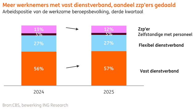 De hernieuwde controle op schijnzelfstandigheid sinds begin 2025 maakten bedrijven ook terughoudend in hun vraag naar flexwerkers. Een deel van het werk dat voorheen door zzp'ers werd gedaan, kon niet langer als zodanig worden uitgevoerd. Dit zorgde voor verschuivingen op de arbeidsmarkt. Bedrijven kozen er vaker voor om zzp'ers zelf in dienst te nemen, via een vast of flexibel contract. Dit blijkt ook uit cijfers van het CBS: in het derde kwartaal van 2025 waren er 73.000 minder zzp'ers actief in de werkzame beroepsbevolking, hun aandeel daalde van 13% naar 12%. Tegelijkertijd nam het aantal werknemers met een vast dienstverband met ruim 100.000 toe. Deze stijging kwam niet alleen door een groeiende beroepsbevolking, maar ook door een verschuiving van een flexibel naar vast dienstverband en de overstap van zzp'ers naar loondienst.
