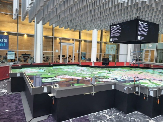 De maquette zelf is een technologisch hoogstandje. Het oppervlak bestaat uit 3D-geprinte panelen die de stad 100% waarheidsgetrouw weergeven. Elk grachtenpand, elk blok en elk iconisch gebouw is tot in detail nagemaakt. "Voor ons heeft 'een blokje om' inmiddels een heel andere lading gekregen," grapt de interieurbouwer over de enorme schaal en de vele details van het project.