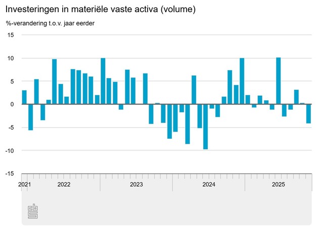 In november 2025 was het volume van de investeringen in materiële vaste activa 4,1 procent kleiner dan een jaar eerder, meldt het Centraal Bureau voor de Statistiek (CBS). Er is vooral minder geïnvesteerd in overig wegvervoer (vrachtauto's, opleggers, busjes, etc.) en gebouwen. In machines (waaronder defensiematerieel), personenauto's en infrastructuur is echter meer geïnvesteerd.
