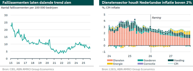 Vooruitkijkend zal de diensteninflatie, gedreven door loonstijgingen en hogere btw-tarieven in de horeca, de grootste bijdrage leveren aan de prijsontwikkeling, terwijl gematigde energieprijzen en dalende goedereninflatie enige verlichting bieden.