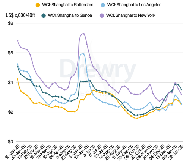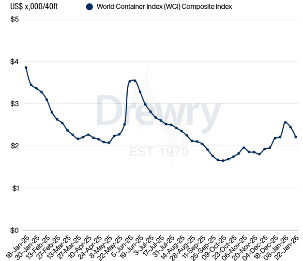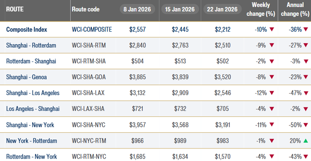 De World Container Index (WCI) van Drewry, een wekelijkse index die de gemiddelde spotprijzen weergeeft voor het vervoer van een 40-voets container op belangrijke mondiale zeevaartroutes, is in de week van 23 januari met 10% gedaald tot $2.212 per 40ft container.