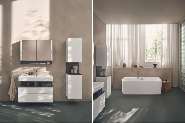 De ontwerpfilosofie komt naar voren in twee badkamerconcepten waarin wordt getoond hoe de collectie aansluit op ingetogen interieurs.
