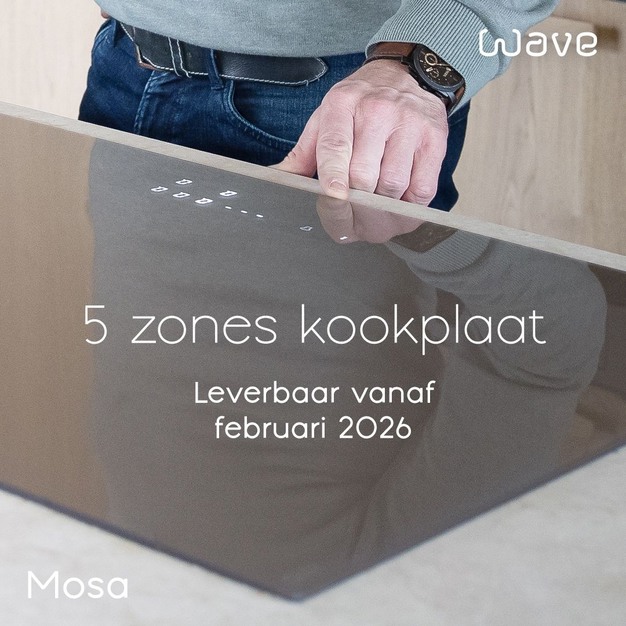 De nieuwe kookplaat heeft vijf kookzones en kan worden gecombineerd met een losse afzuigkap, zoals de lampachtige afzuigkap of de Frame-afzuigkap van Wave. De Wave Colour Collection biedt zeven lakkleuren, waardoor de kookplaat en afzuigkap visueel op elkaar kunnen worden afgestemd.