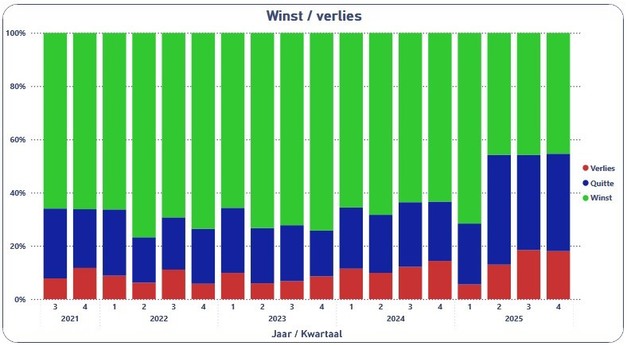 De internationale markt schetst echter een somberder beeld. De buitenlandse vraag is met 11% gedaald ten opzichte van het vorige kwartaal, waarmee een einde komt aan de opwaartse trend die sinds medio 2024 zichtbaar was. Ook voor het komende kwartaal blijven de exportverwachtingen negatief.