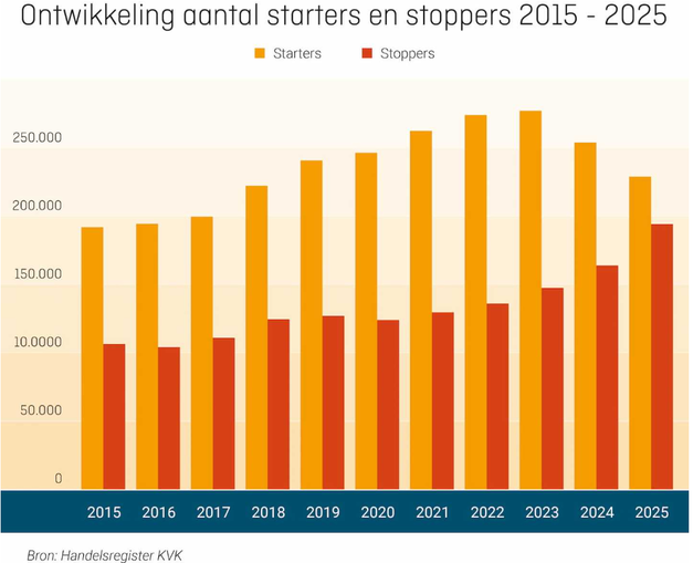 De stagnatie wordt veroorzaakt door een daling van het aantal starters met 10% en een stijging van het aantal stoppers met 18% ten opzichte van 2024. In alle sectoren nam het aantal opheffingen toe, met name onder zzp'ers: zij stopten in 2025 opvallend vaak (+19%) terwijl het aantal starters met 13% afnam. Tegelijkertijd daalde het aantal faillissementen met 21%, wat mogelijk te verklaren is doordat ondernemers eerder stoppen voordat financiële problemen ontstaan.