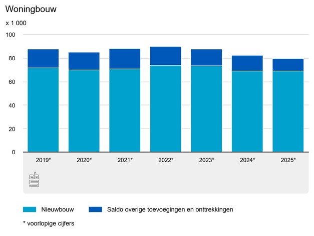 In 2025 zijn bijna 80 duizend woningen aan de voorraad toegevoegd door nieuwbouw en andere vormen van woningbouw. Hiermee daalt het aantal opgeleverde woningen voor het derde jaar sinds 2022. Ook is er voor bijna 86 duizend nieuwbouwwoningen een vergunning afgegeven. In 2024 was dit nog bijna 94 duizend. Dit meldt het Centraal Bureau voor de Statistiek (CBS) op basis van nieuwe cijfers.