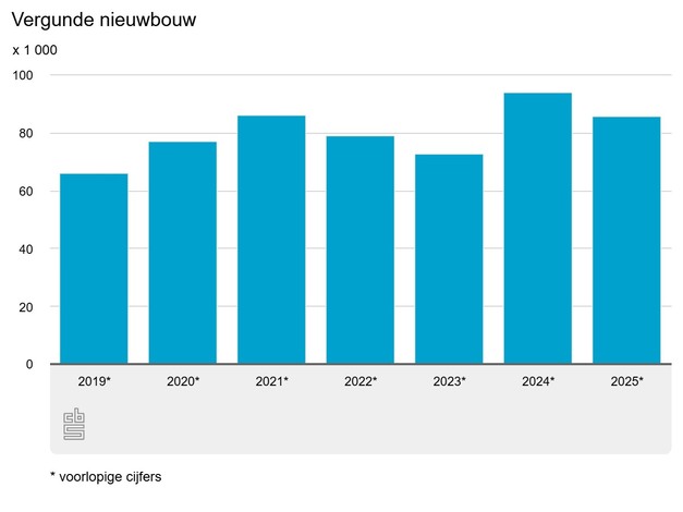 In 2025 is voor bijna 86 duizend nieuwbouwwoningen een vergunning afgegeven. Ondanks dat afgelopen twee jaren meer vergunningen dan in de vijf jaar daarvoor zijn verleend, leidt dat niet direct tot meer nieuwbouw. Het duurt steeds langer om nieuwe woningen te bouwen nadat er een vergunning is afgegeven. Bovendien worden sommige vergunningen later weer ingetrokken. Sinds 2019 schommelt dit tussen de drie en vijf procent.