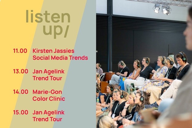 In het listenUP-theater vinden diverse talks plaats, waaronder sessies van Kirsten Jassies over actuele socialmediatrends en van Marie-Gon over effectief kleurgebruik in de winkel. Beide sessies bieden praktische handvatten voor retailers en interieurprofessionals.
