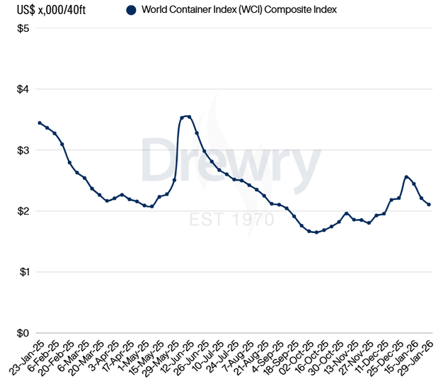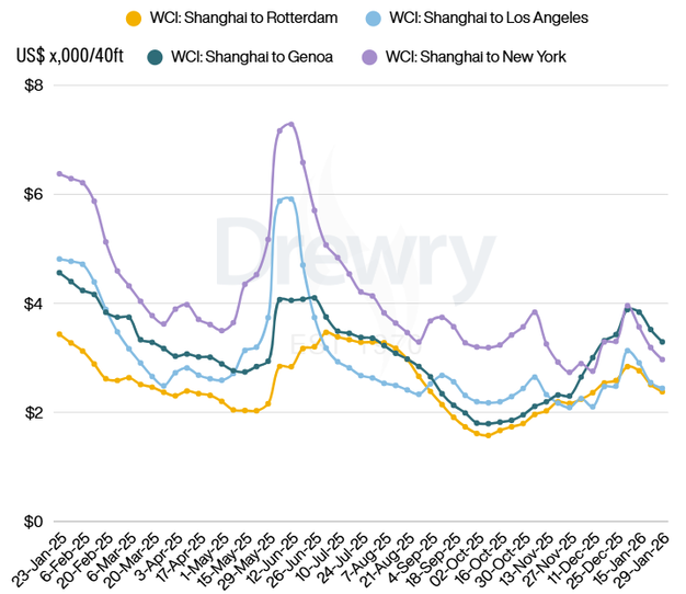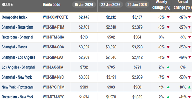 De World Container Index (WCI) van Drewry, een wekelijkse index die de gemiddelde spotprijzen weergeeft voor het vervoer van een 40-voets container op belangrijke mondiale zeevaartroutes, is in de week van 30 jaunari is met 5% tot $2.107 per 40ft container.