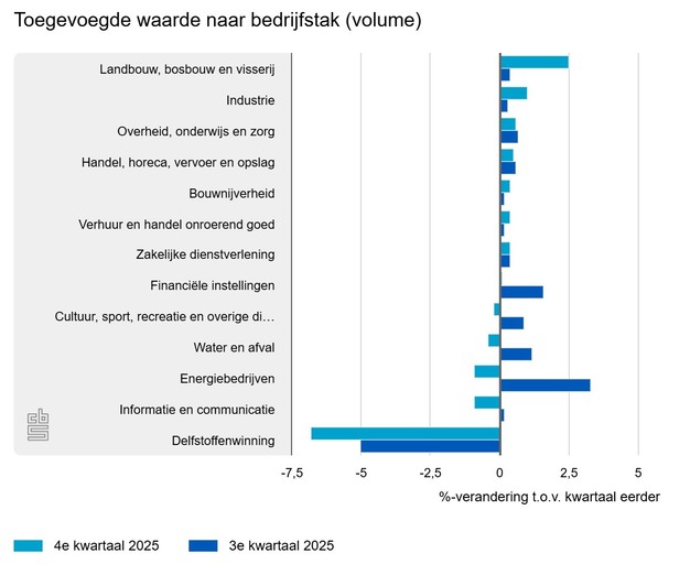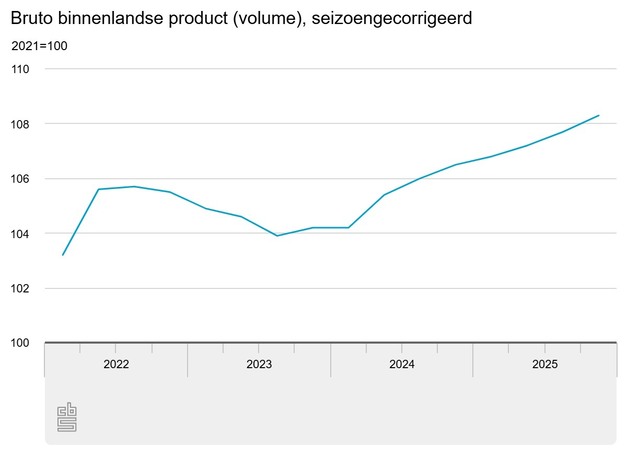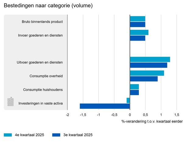 Volgens de eerste berekening van het CBS, op basis van nu beschikbare gegevens, steeg het bruto binnenlands product (bbp) in het vierde kwartaal van 2025 met 0,5 procent ten opzichte van het derde kwartaal van 2025. In het derde kwartaal was de groei ook 0,5 procent. De stijging van het bbp in het vierde kwartaal is vooral toe te schrijven aan de uitvoer en de overheidsconsumptie.