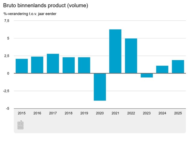 De economie groeide in het vierde kwartaal van 2025 met 1,8 procent ten opzichte van het vierde kwartaal van 2024. Met het beschikbaar komen van het vierde kwartaal is ook het eerste voorlopige groeicijfer voor het jaar 2025 bekend. Het bbp is vorig jaar met 1,9 procent gegroeid. Dat is meer dan in 2024, toen de economie met 1,1 procent groeide. De gemiddelde groei in de afgelopen 30 jaar was ongeveer 2,0 procent per jaar.