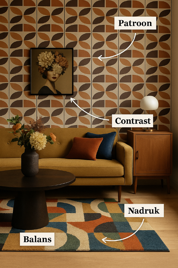 Patroon zorgt voor orde en rust, mits bewust toegepast. Contrast brengt spanning en energie in een ruimte, terwijl nadruk voorkomt dat een interieur één vlak geheel wordt. Balans gaat over de verdeling van visueel gewicht, essentieel om ook kleinere ruimtes te laten ademen.