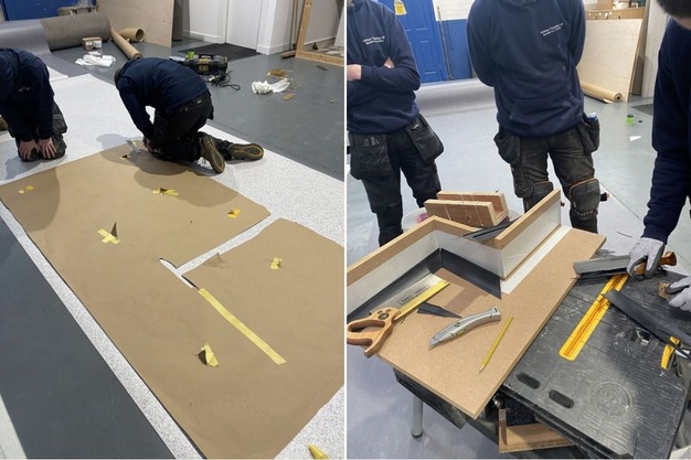 Steve Davies, National Training Manager bij Uzin Utz, begeleidde onlangs een volledige trainingsdag voor het jonge team van Kirkton Flooring. Tijdens de sessie werden verschillende installatietechnieken voor vinyl en linoleum behandeld, waaronder templating, scribing en het gebruik van Wolff-gereedschappen om de werkzaamheden efficiënter uit te voeren.