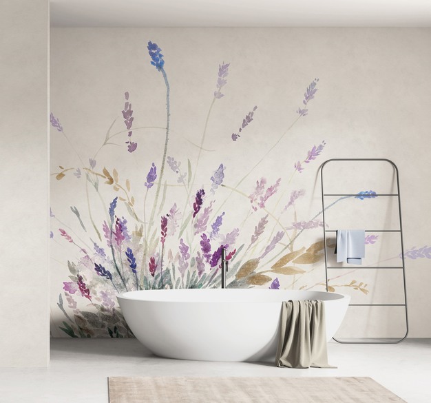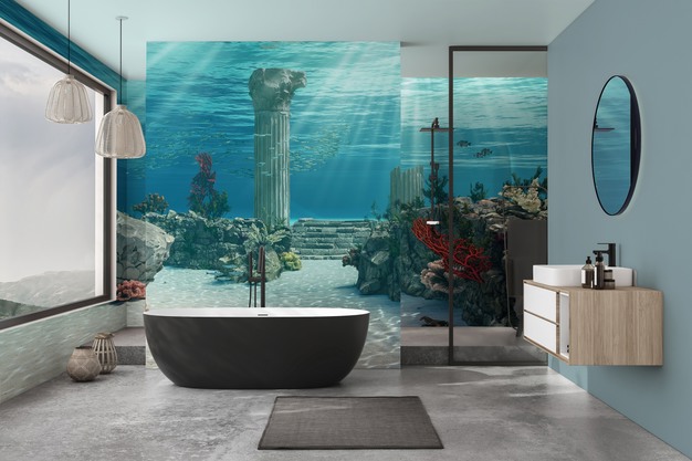 In badkamers kunnen de wallpapers niet alleen op traditionele muren worden aangebracht, maar ook over bestaande tegels, in douchecabines, achter sanitaire elementen of rondom badkuipen. Dit creëert een doorlopende en volledig aanpasbare decoratieve oplossing.
