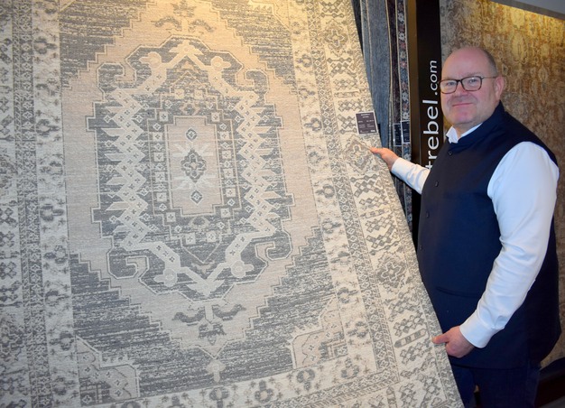 Patrick met de nieuwe Bhakash-collectie: 100% wol, zeer vlak en daardoor ook zeer sterk. Makkelijk toepasbaar vanwege de naturele kleuren, aldus de vakspecialist.