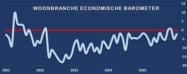 Na een flinke daling van de woonbranche economische barometer in december toont de barometerstand in januari weer enig herstel. De barometerstand steeg in de maand januari met 2,6 punten ten opzichte van de voorgaande maand. Daarmee komt de woonbranche economische barometer eind januari uit op een stand van -2,3. De verbetering wordt met name veroorzaakt door positieve cijfers over de woningmarkt. De cijfers over de omzetontwikkeling van woondetaillisten en het consumentenvertrouwen waren echter teleurstellend.