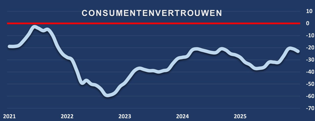 Het vertrouwen van consumenten is in januari negatiever dan een maand eerder, meldt het Centraal Bureau voor de Statistiek (CBS). Het consumentenvertrouwen gaat van -21 in december naar -23 in januari. Consumenten zijn in januari negatiever over de economie dan in december. De deelindicator economisch klimaat daalt van -35 naar -40. Vooral het oordeel over de economische situatie in de komende 12 maanden verslechtert, maar ook het oordeel over de economische situatie in de afgelopen twaalf maanden is negatiever. Daarnaast vinden consumenten de tijd voor het doen van grote aankopen in januari ongunstiger dan in december.