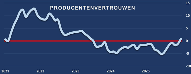 Producenten zijn in januari positiever dan een maand eerder. Het producentenvertrouwen industrie gaat van –1,1 in december naar 0,8 in januari, aldus het Centraal Bureau voor de Statistiek (CBS). Producenten zijn wat minder negatiever over de voorraden gereed product en over de orderpositie. Het oordeel over de verwachte bedrijvigheid is behoorlijk toegenomen. Een deelindicator is positief. Het aantal producenten dat verwacht dat hun productie de komende drie maanden zal toenemen is groter dan het aantal dat een afname van de productie voorziet. De andere twee deelindicatoren van het producentenvertrouwen zijn negatief. Het aantal producenten dat de orderpositie groot acht, is kleiner dan het aantal dat de orderportefeuille klein vindt, gelet op de tijd van het jaar. Het aantal producenten dat de voorraad eindproduct als klein beschouwt, is kleiner dan het aantal dat de voorraden groot vindt.