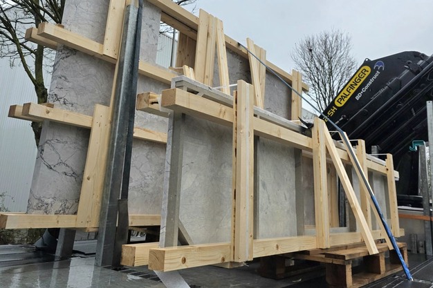 De trend naar steeds grotere en luxere keukens stelt interieurbouwers voor flinke logistieke uitdagingen. Jos Creemers, eigenaar van CreJos Keukens - Interieurs, illustreerde dit onlangs met de levering van een omvangrijk project waarbij een kraan en zwaar transport noodzakelijk waren om de werkbladen op hun plek te krijgen.