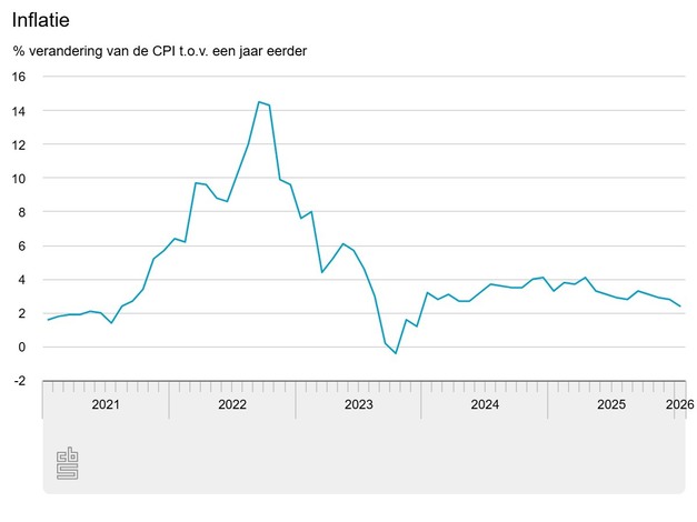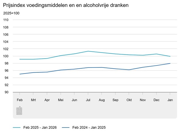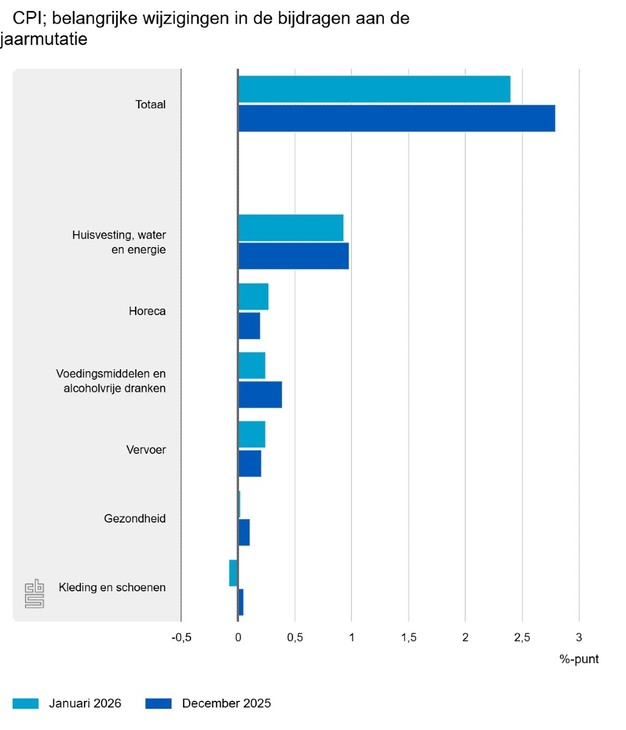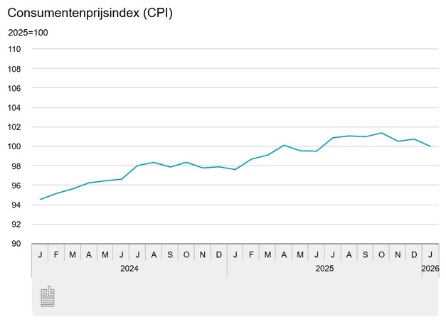 In januari 2026 waren consumentengoederen en -diensten 2,4 procent duurder dan een jaar eerder, meldt het Centraal Bureau voor de Statistiek (CBS). In december 2025 was de inflatie 2,8 procent. De prijsontwikkeling van voedingsmiddelen en alcoholvrije dranken droeg het meest bij aan de daling van de inflatie. Het inflatiecijfer van januari is hetzelfde als bij de snelle raming die op 4 februari is gepubliceerd.