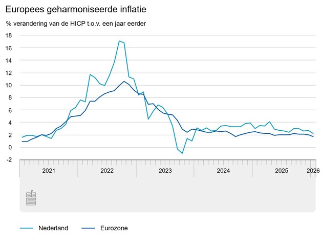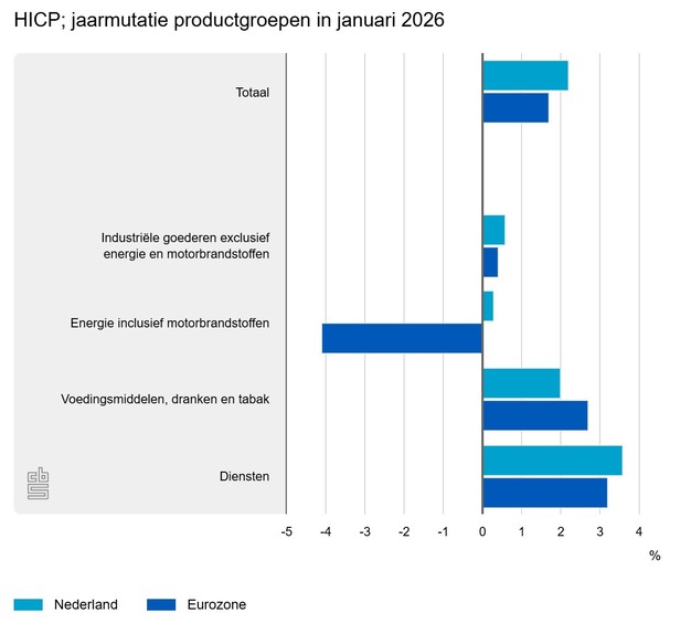 De inflatie in de eurozone was in januari 2026 lager dan in Nederland. De prijzen van energie waren in januari 2026 in de eurozone lager dan in januari vorig jaar, terwijl deze in Nederland hoger waren. Daarnaast was de prijsstijging bij diensten en industriële goederen in januari in Nederland groter dan gemiddeld in de eurozone.