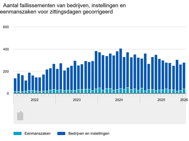 In januari zijn, voor zittingsdagen gecorrigeerd, 279 bedrijven failliet verklaard, meldt het CBS. Dat zijn 39 minder faillissementen dan in dezelfde periode een jaar eerder, een daling van 12 procent. Ten opzichte van december is het aantal faillissementen gestegen met 6 procent.