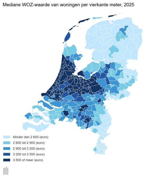 In 2025 bedroeg de mediane WOZ-waarde van woningen per vierkante meter woonoppervlakte bijna 3 320 euro. In de Randstad is de WOZ per vierkante meter het hoogst, maar de afgelopen vier jaar is de stijging daarbuiten juist het sterkst. Dit meldt het Centraal Bureau voor de Statistiek (CBS) op basis van nieuw onderzoek.
