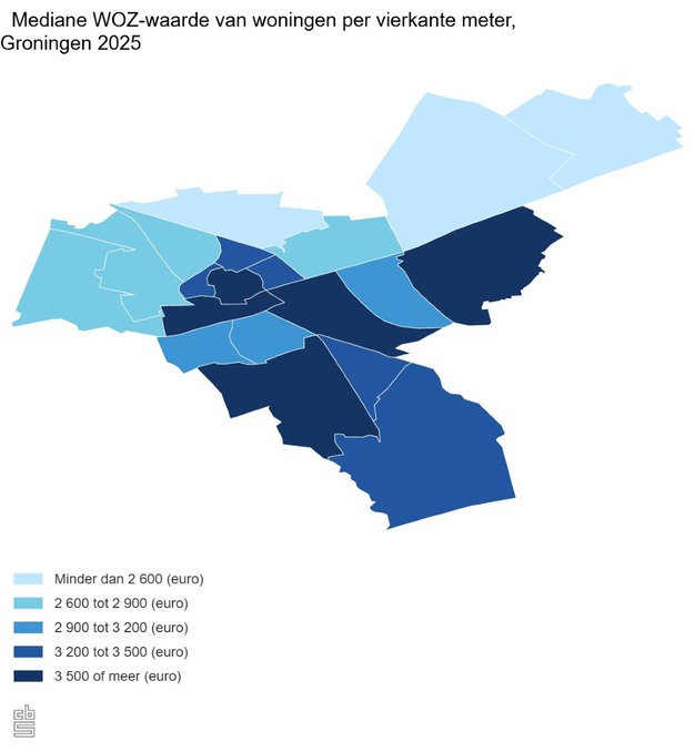 Niet alleen tussen gemeenten zijn er grote verschillen, maar ook tussen wijken binnen gemeenten. Bijvoorbeeld in de gemeente Groningen. In de wijken Groningen Centrum en Meerstad en omgeving is de WOZ per vierkante meter het hoogst, met respectievelijk 3 920 en 3 820 euro. In Ten Post e.o. is de WOZ per vierkante meter met 1 850 euro het laagst.
