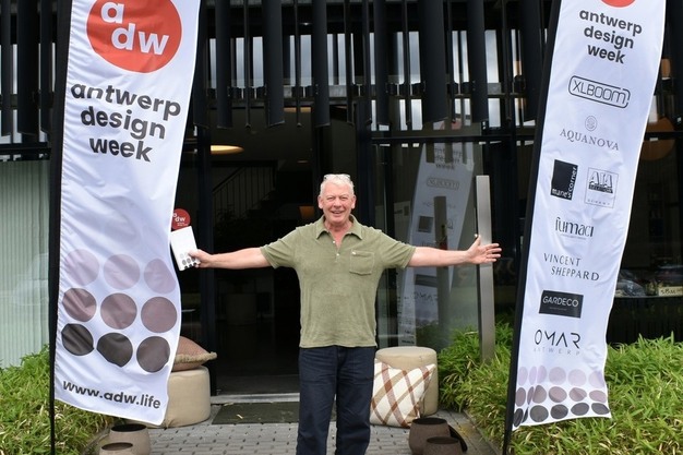 Voorzitter Geert-Jan Van Cauwelaert van Antwerp Design Week, tijdens de vorige editie poserend bij de ingang van XLBoom, benadrukt het belang van verbinding. De organisatie wil bedrijven samenbrengen, kruisbestuiving stimuleren en zo Belgisch design internationaal op de kaart zetten.