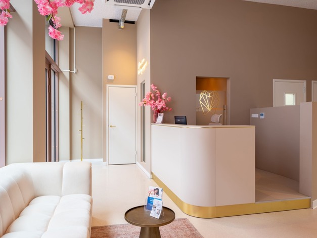 Rusink Interieur B.V. verzorgde de inrichting van een tandartspraktijk, inclusief de entreebalie en maatwerk kasten in de behandelkamers. Bij binnenkomst wordt bezoekers een warme, uitnodigende sfeer geboden, met subtiele gouden accenten die het interieur een verfijnde uitstraling geven.