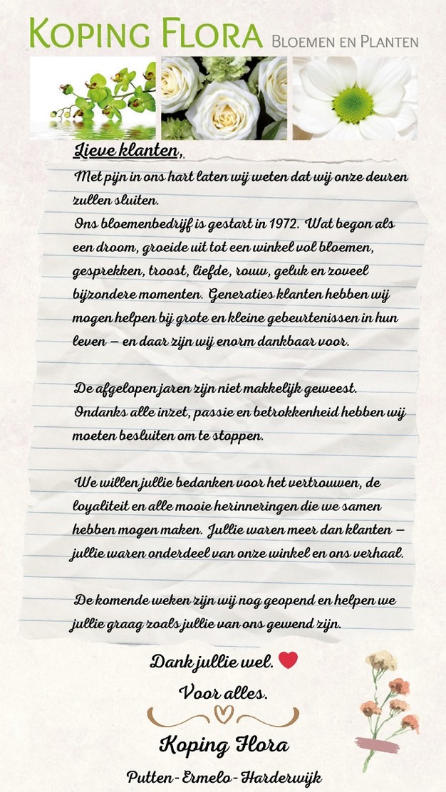 "Met pijn in ons hart laten wij weten dat wij onze deuren zullen sluiten," schrijft het team van Koping Flora. Wat in 1972 begon als een droom van Joop en Bea van Wijk, groeide uit tot een regionaal begrip dat drie generaties omvatte. De afgelopen jaren bleken echter te zwaar om de exploitatie van de winkels en de eigen groothandel voort te zetten.