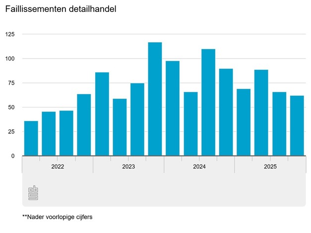 In het vierde kwartaal van 2025 zijn 62 detailhandelaren failliet verklaard. Een jaar eerder waren dat er 90. In totaal zijn er onder bedrijven, instellingen en eenmanszaken 828 faillissementen uitgesproken. In het laatste kwartaal van 2024 waren dat er bijna