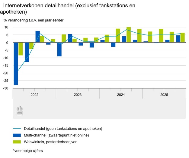Detailhandelaren zetten online 5,8 procent meer om dan in dezelfde periode een jaar eerder. Bij winkels die alleen online verkopen is dat zelfs 6,4 procent. Detaillisten die hun producten online en in een fysieke winkel verkopen (multichannelers) boeken 4,9 procent meer omzet.